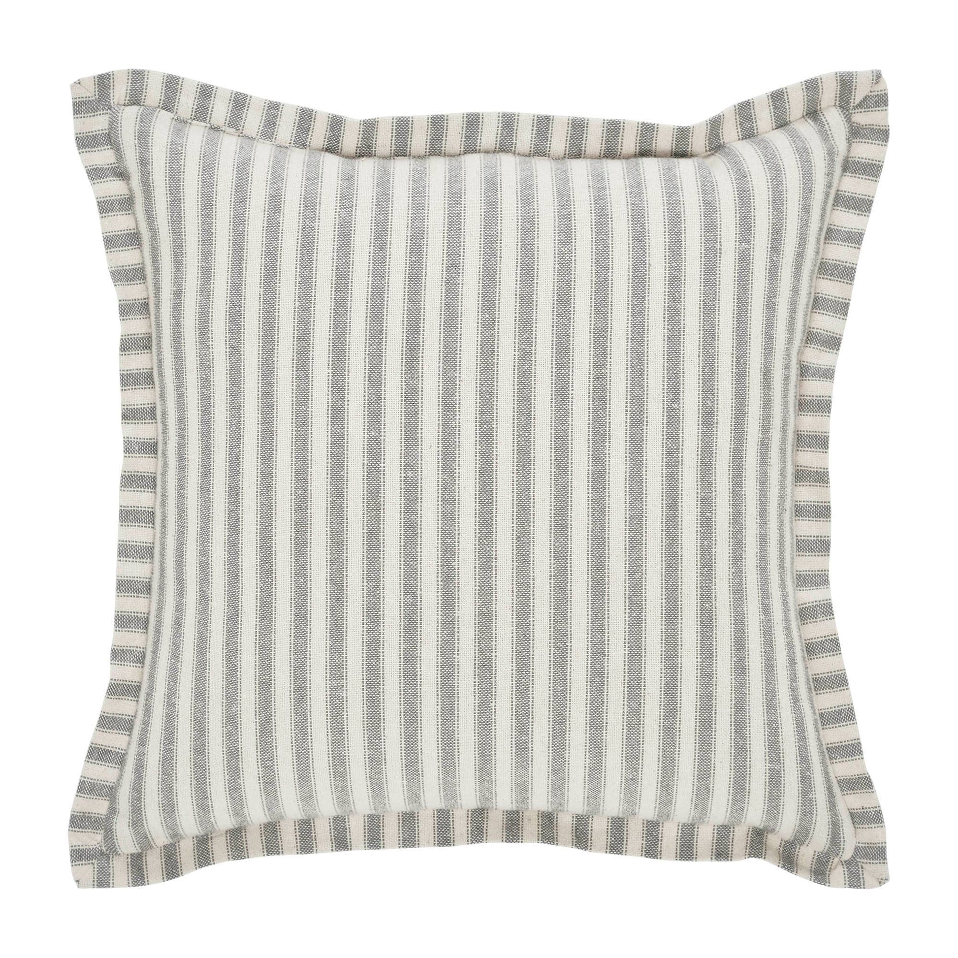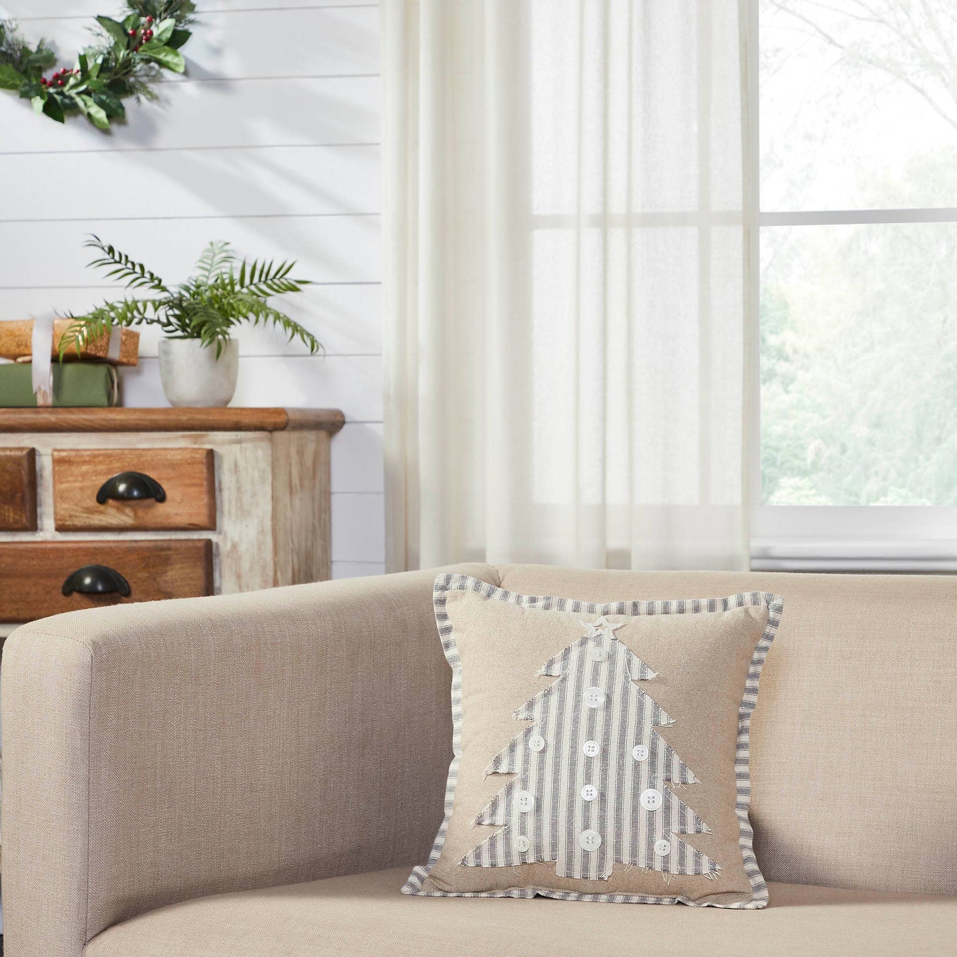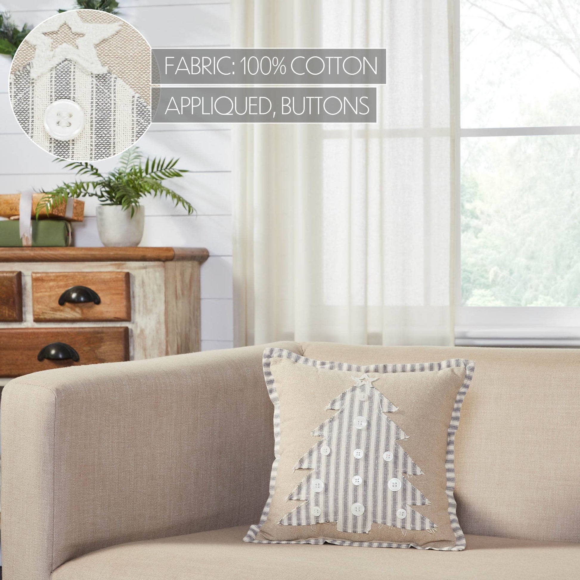 Add a neutral and charming pop of festive style with this Christmas accent pillow. The Grace Applique Tree Pillow measures 12 by 12 inches. The filled pillow features a deep tan applique creating a cutout Christmas tree design for a charming farmhouse look with seasonal flair. An assortment of creme poly pearl buttons create the look of ornaments. The cozy home accessory is crafted with a classic ticking stripe fabric for casual farmhouse style while a frayed edge to the design produces a soft and cheerful look. Care Instructions: Spot Clean Material: 100% Cotton Shell, Polyester Pillow Fill
