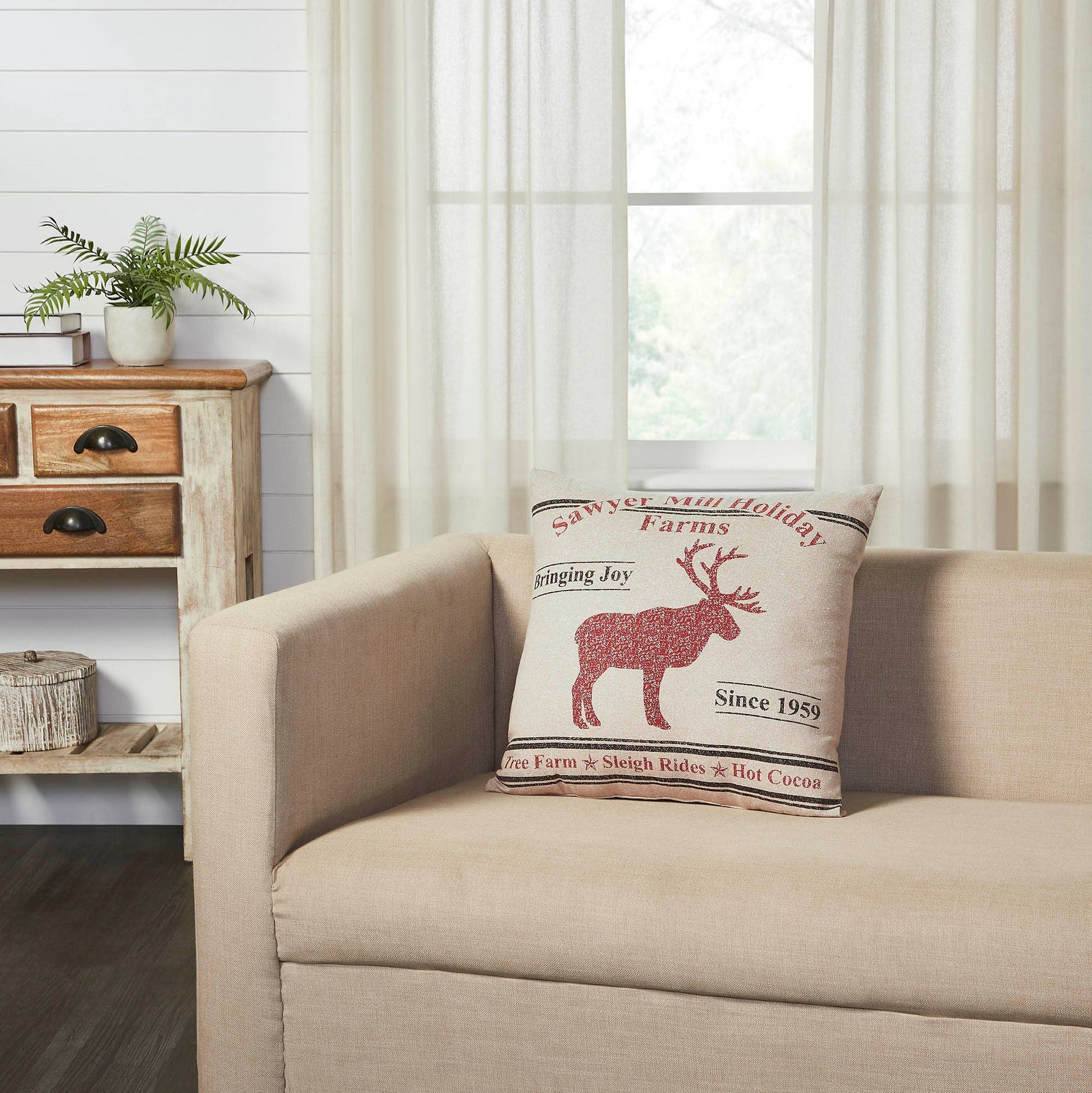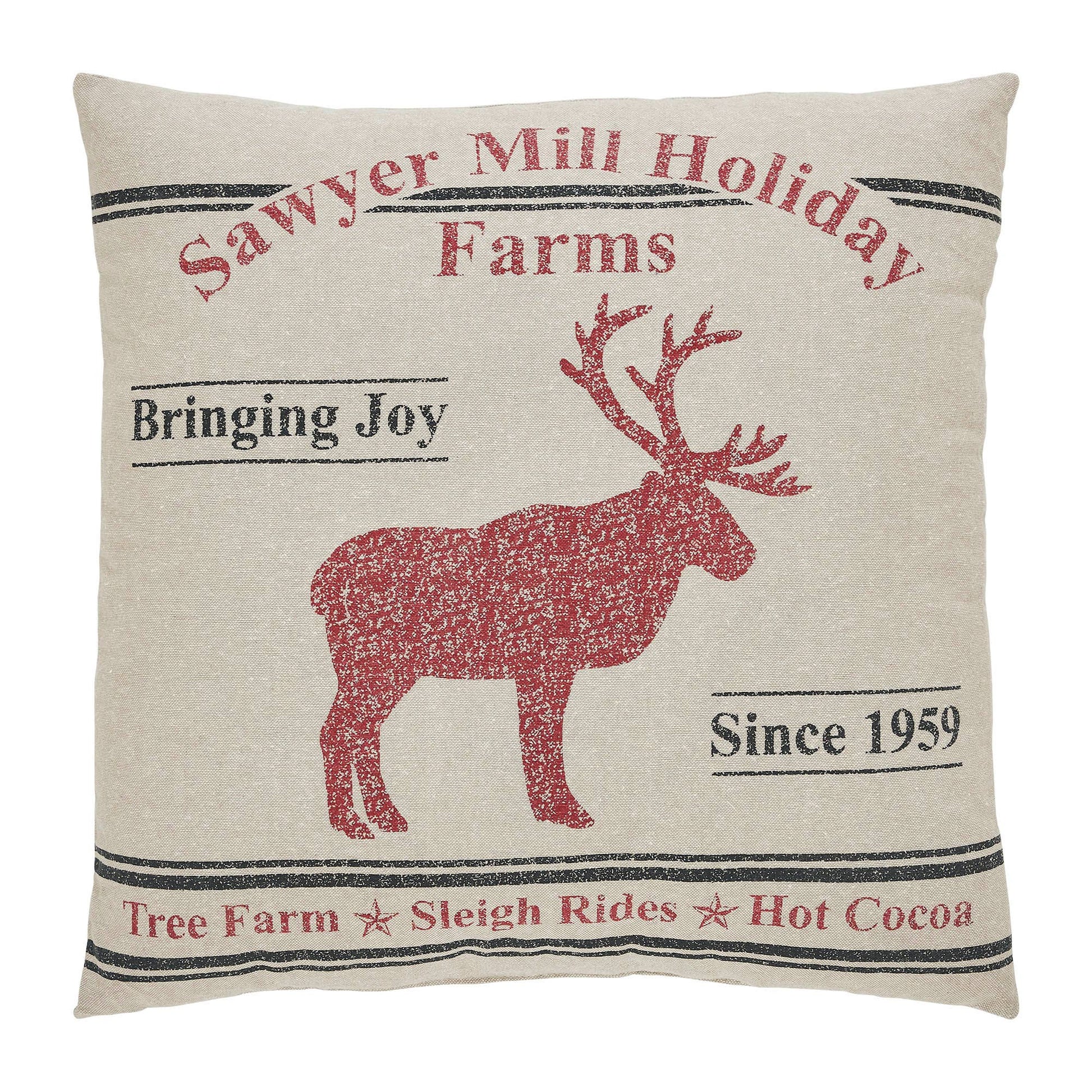 Create a warm, vintage inspired look for your holiday decor with this farmhouse Christmas accent pillow. The Sawyer Mill Reindeer Pillow measures 18 by 18 inches. The filled pillow features a charming distressed print on a warm tan base. The front of the pillow includes two grain sack style stripes framing a charming reindeer print in deep red. Word art surrounding the design creates the look of a charming vintage farm advertisement. Spot clean as needed. Coordinates with the Sawyer Mill Care Instructions: Spot Clean Material: 100% Cotton Shell, Polyester Lining, Polyester Pillow Fill
